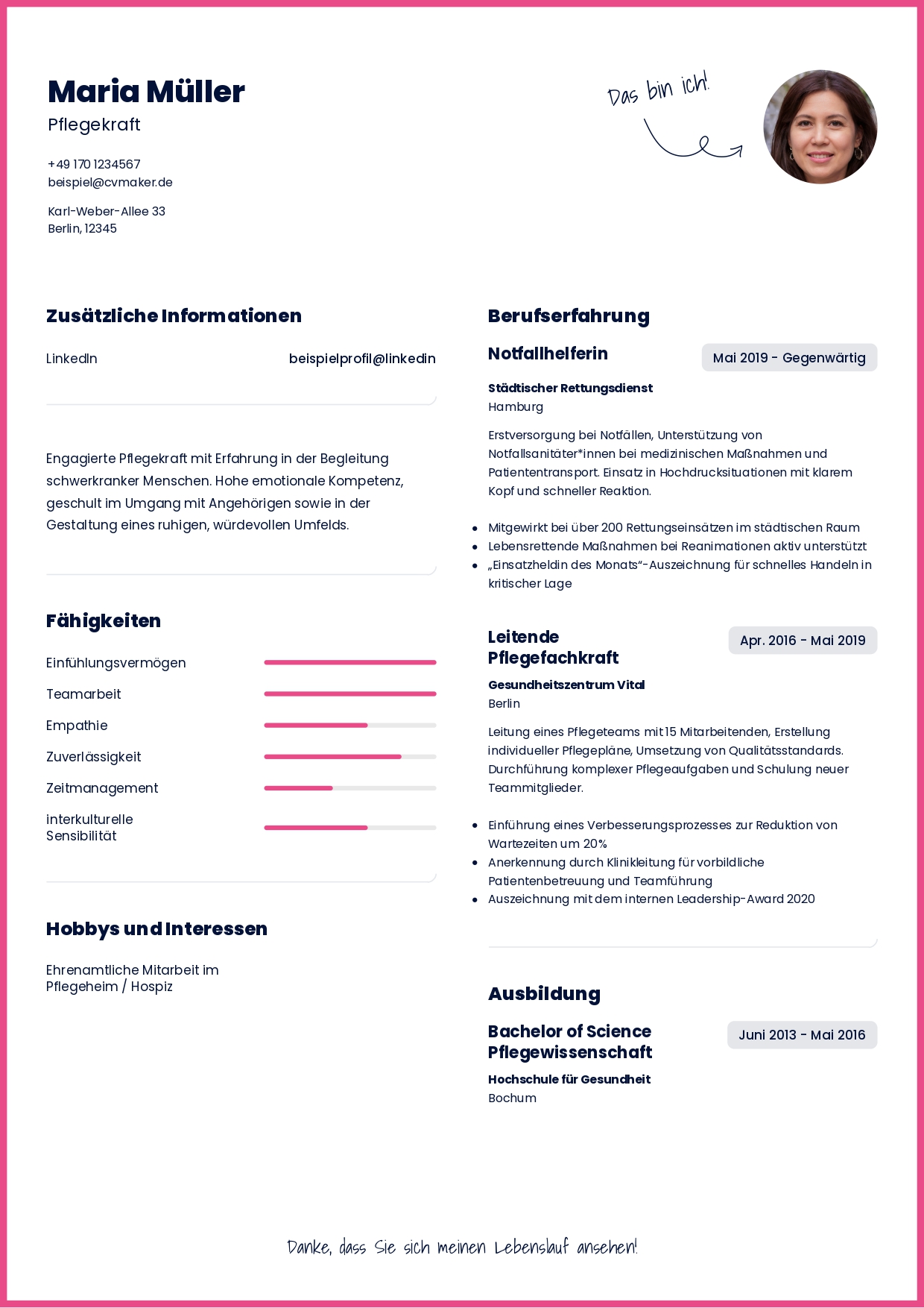 Viele deutsche Lebensläufe beginnen mit der Kontaktzeile, darunter die Adresse und dann kommt der Rest. Das ist praktisch, übersichtlich und niemand stolpert darüber.